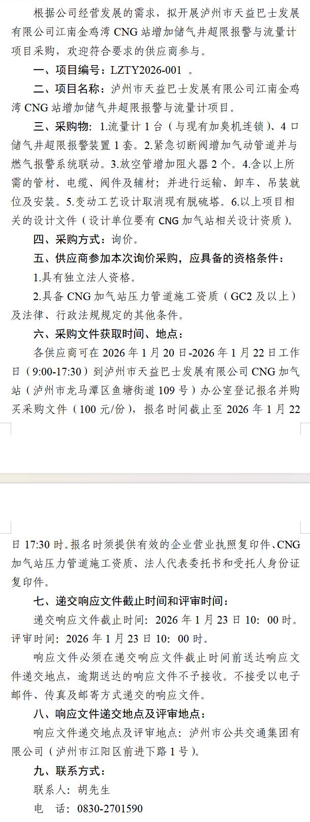 瀘州市天益巴士發(fā)展有限公司江南金雞灣CNG站增加儲氣井超限報(bào)警與流量計(jì)項(xiàng)目采購公告